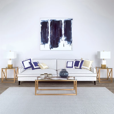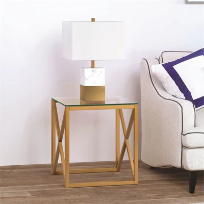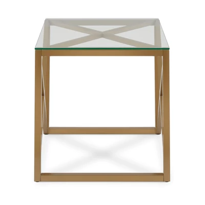 A combination of modern flair with a touch mid-century design will make this glass side table the perfect complement to your bedside or sofa. Geometric X-s in the premium metal frame takes a minimalist table to the next level. The sturdy pedestal legs offer functionality and a sturdy base for your drinks, knickknacks and magazines.Features : Hand crafted gold finish is applied to the steel frame. Tempered glass top.Clean with a soft, dry cloth; no harsh chemicals or abrasive cleaning materials.Features easy assembly.Weight capacity can support up to 50 LBS.Premium materials have been used in the making of this productSpecifications : Product Weight : 23.3 lbsFrame Material : Metal