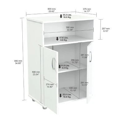 Microwave/Storage Cabinet by Inval finished in a rich “White” laminates in durable melamine which is stain, heat and scratch resistant. Constructed from manufactured wood. This unit has an excellent design that is just the right choice for your home or office break room. It features two doors which conceal a shelf to provide ample storage space as well as an open shelf for additional accessory storage. The unit sits on four round plastic gliders.