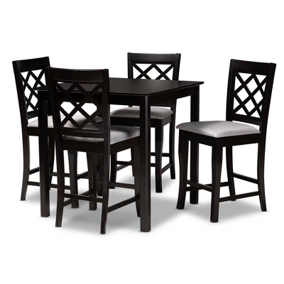 A fusion of traditional design elements and modern craftsmanship make the Alora 5pc pub set a stunning addition to any dining space. Constructed from solid oak wood in an espresso finish, this pub set includes one table and four stools, each upholstered in a light polyester fabric that complements the dark wood finish. Padded with foam for the utmost comfort as you enjoy long dinners, each stool features a striking cut-out design on its back for enhanced visual appeal. Comfortable and stylish, the Alora set is sure to elevate any dining experience. The Alora 5pc pub set is made in Malaysia and requires assembly.