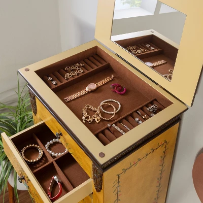 Antique Parchment Hand painted Jewelry Armoire is hand painted with floral arrangement on the face and hand carved with the look of Golden Antique Parchment. Includes a flip top with inset mirror. Reveals 2 rows of ring pads and open center section. There are 7 fully lined and divided drawers: 1st drawer- 9 squares, 2nd drawer- 6 squares, and 3rd through 7th drawers- open. 2 swing doors with 100% rayon brown lining. Minimal assembly attach top only. Easy to maintain, simply spot or wipe clean.