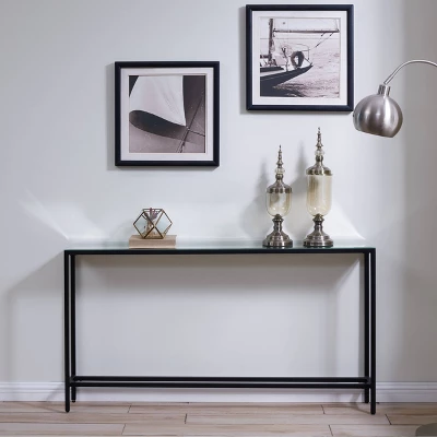 Expand your display space with the Aiden Lane Dillard Narrow Long Console Table. A wide, mirrored tabletop shows off framed photos, décor pieces, or flowers, while the slim, space-saving design slides neatly behind your sofa or into your foyer. A sleek metal frame keeps your living space clean and uncluttered, defining your small space or open concept floorplan in simple style. Enjoy your décor without sacrificing space with this narrow sofa table.