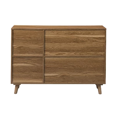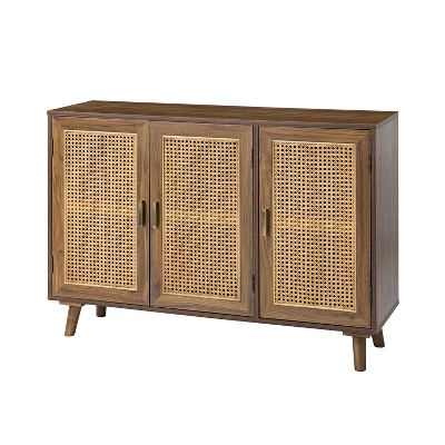 Looking to add an extra storage addition that compromises your style? The contemporary accent cabinet is ready to help. Easily keeping clutter under control with this cabinet made of solid and manufactured wood in a classic finish. Behind its three rattan doors with retro metal bar pulls is a hidden storage area that includes two spacious shelves, providing plenty of storage to sort out. This sturdy frame standing atop four legs features a long using life with perfect stability and durability. Its simple design and charming style make this storage cabinet perfect for any room in your home – living room, down the hallway, dining room, or even the bedroom.Item Size:43″Wx13.5Dx30.1″H