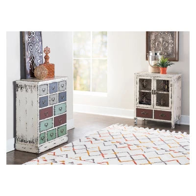 The Garrick 2-Drawer Console Table combines an antique, weathered look with a rustic, industrial feel. Its distressed look is trendy, popular and full of unique character. The Layered Antique White finished console features two doors and two drawers that provide an abundant amount of storage space. Decorative pulls accent the fronts of each drawer. A unique addition to any space in your home. Fully assembled. This console is easy to maintain, simply dry dust to sustain the care of this item.