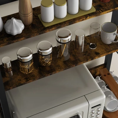 HOMCOM Kitchen Bakers Rack, Microwave Stand, Coffee Bar With Adjustable Shelves, 4 Hooks For Spices, Pots And Pans, Rustic Brown