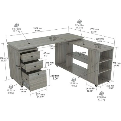 L-Shaped Computer Workstation by Inval finished in a rich “Smoke Oak” laminate with durable melamine which is stain, heat and scratch resistant. It is constructed from manufactured wood. This corner computer desk offers a spacious work surface making it a perfect addition to any home office or office. It has a 1″ top with 1.5mm edge banding and it can be assembled in a left or right configuration. It features one (1) file drawer with full extension metal drawer glides which accommodates letter or legal sized files, and two (2) accessory drawers with brushed metal slides for storing supplies. All drawers have brushed metal knobs. The unit offers an ample work space, shelves for books, dedicated CPU storage, printer space and space for other accessories. Plastic sliders protect the unit and allow for easy mobility when cleaning or rearranging your room dĂ©cor.