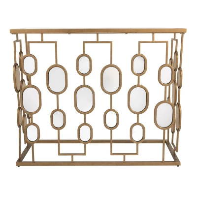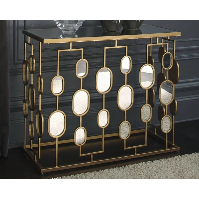 Let your sense of high design shine with this console table. Mirrored glass and a luminous goldtone finish make luxury a part of everyday living. Minimalist-chic styling is sure to open up a space beautifully. Constructed of Metal in Antique Gold Finish and Mirror. Signature Design by Ashley is a registered trademark of Ashley Furniture Industries, Inc.