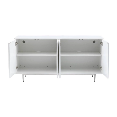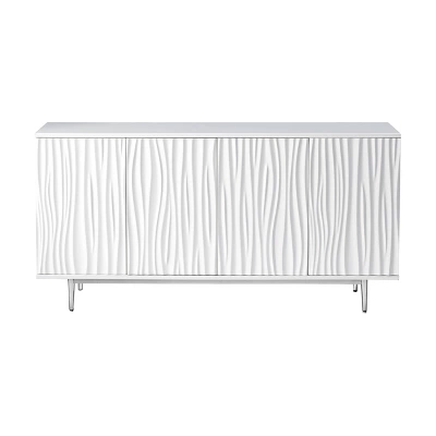Like the wind blowing through tall strands of sea grass, the highly textured body of this dazzling four door Credenza seems to flow with a movement all its own. Finished in our Waves Glossy White for a hi-gloss sheen, and perched atop a polished chrome finished stainless steel base, this Credenza will be the highlight of any room. With a spacious shelved interior, the perfect choice for your family room, den or foyer.