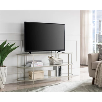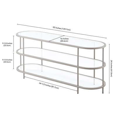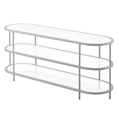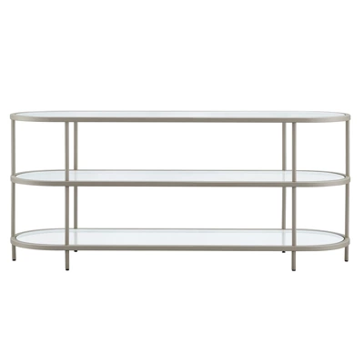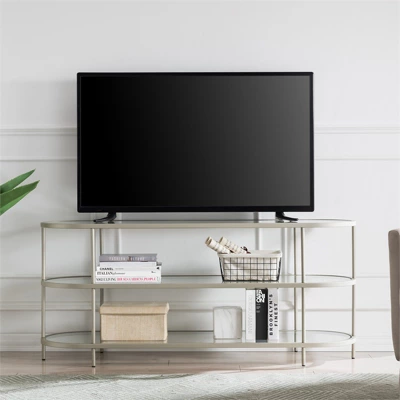 Combine functionality and on-trend design with this eye-catching oval TV stand. Its curved tempered glass top and shelves are offset by your choice of neutral metallic finishes. The clean lines of its steel frame instantly update your entertainment space, pairing perfectly with your modern living room or mid-century den.Features : Accommodates TVs up to 60″.Features a tempered glass top and shelves.Weight capacity is 65 lbs. on top, 30 lbs. on middle shelf, and 40 lbs. on bottom shelf.Features easy assembly.Clean with a soft, dry cloth; no harsh chemicals or abrasive cleaning materials.Specifications : Product Weight : 56.40 lbs
