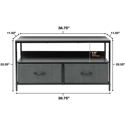 - SMART & STYLISH DESIGN — Sleek wide storage — Made with strong steel frame and durable MDF wood top with smooth finish — Drawers made of breathable, non-woven fabric — Wipe clean — Minimal assembly required — Hardware and instructions INCLUDED — Middle Shelf 8.25” H— Entire Unit Approximately 38.75” L x 11.50” W x 22.25” H